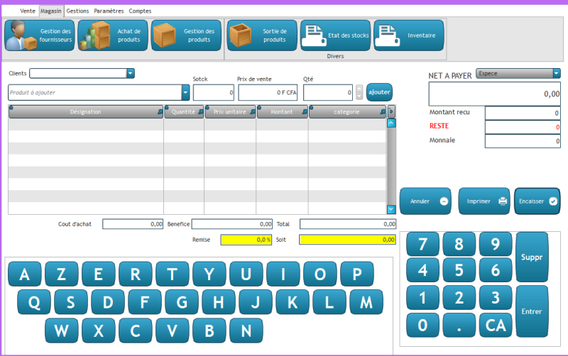 - Saisie de caisse rapide et intuitive : interface fluide, clavier tactile, raccourcis et lecture de code-barres.